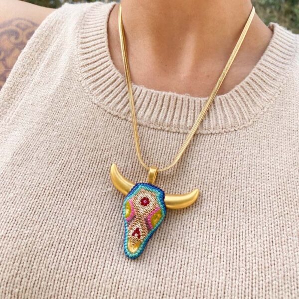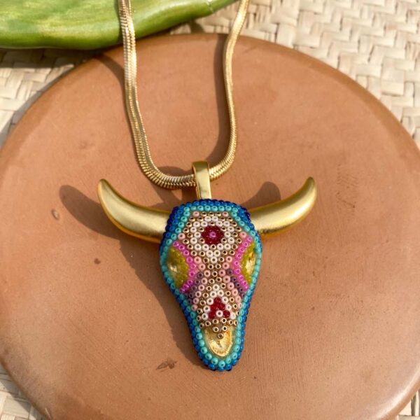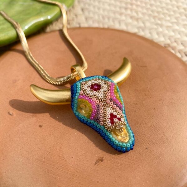 Base de chapa de oro decorada con chaquiras por artesanos wixarika de Nayarit, México