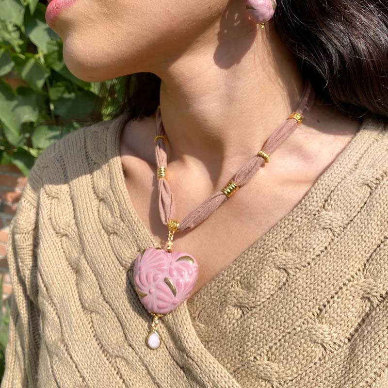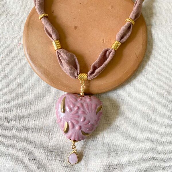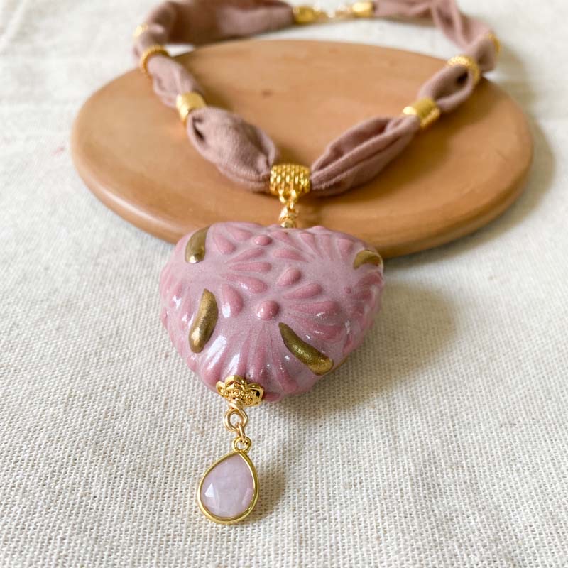 Collar con barro negro, complementos en chapa de oro y tela de algodón tenida con tinte natural de copal