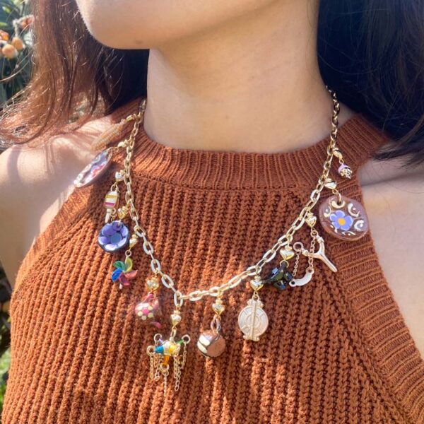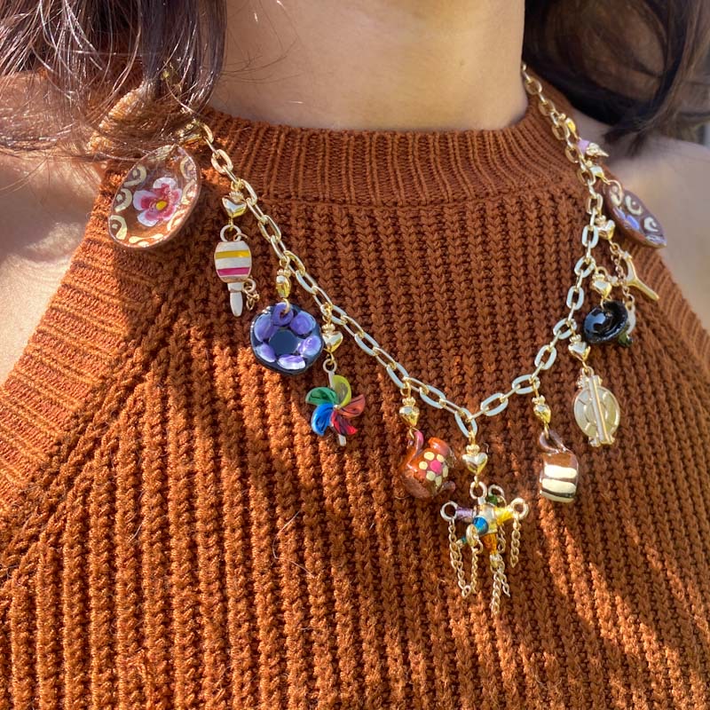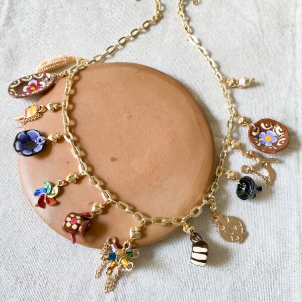 Collar en chapa de oro y complementos de barro y chapa esmaltada