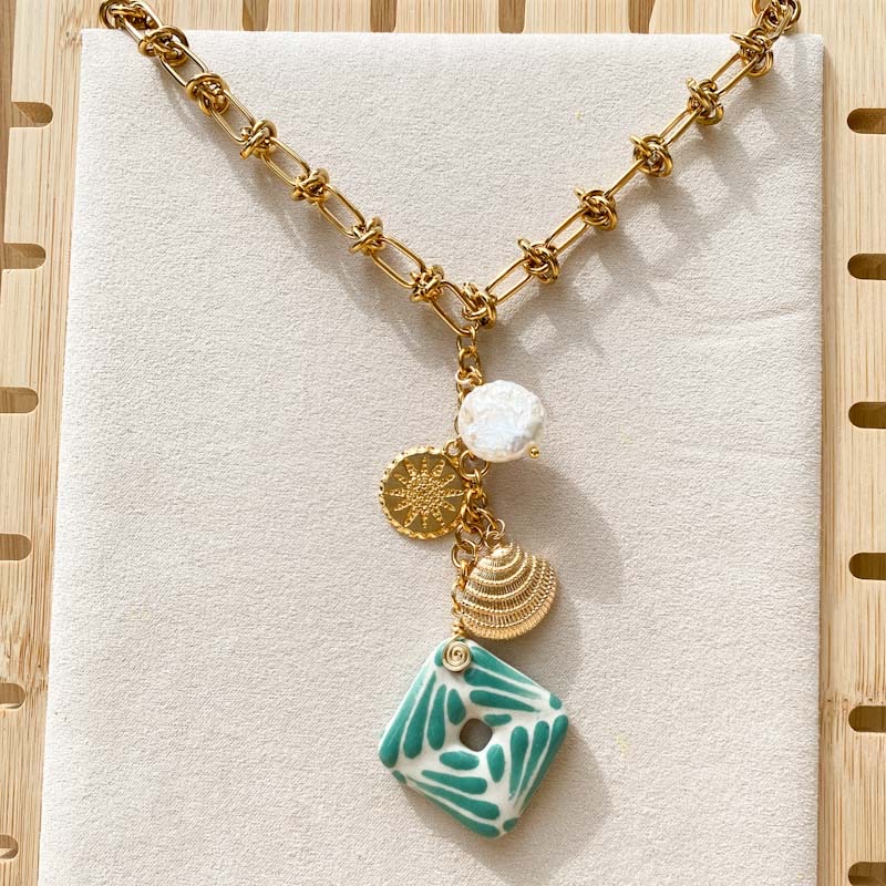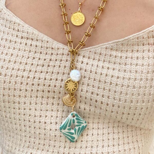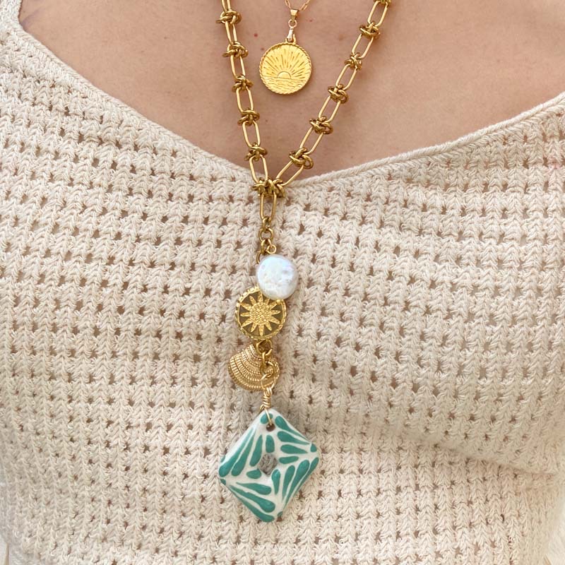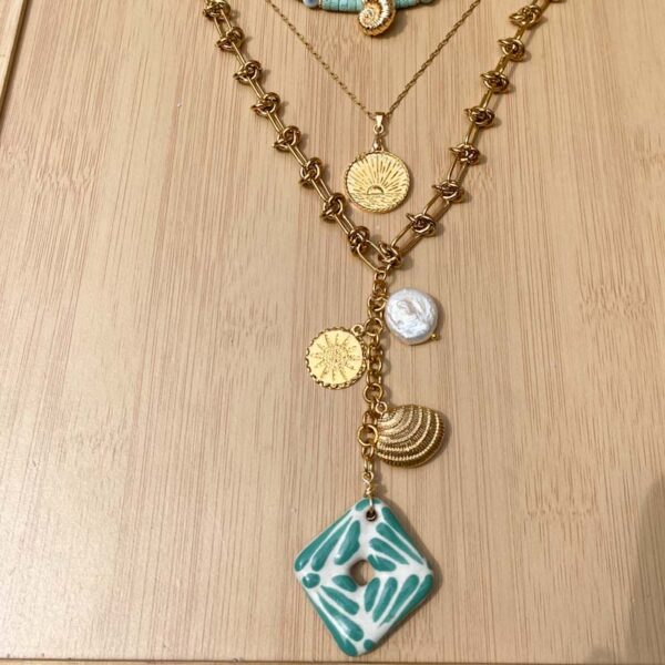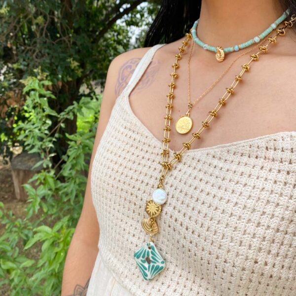 Collar largo: Cadena de acero inoxidable, chapa de oro, talaveranos y perla de rio. Largo 60cm